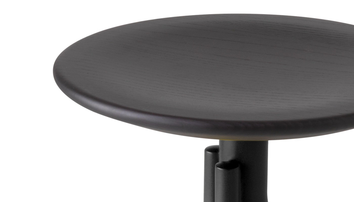 Originale e solido, Main sgabello, disponibile in due altezze, si caratterizza per una vistosa asimmetria dovuta alla gamba che funge anche da sostegno del sedile, dal diametro doppio.