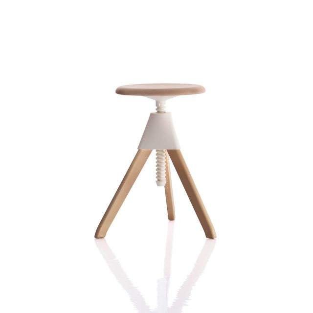 Tom & Jerry, sgabelli a tre gambe di Konstantin Grcic per Magis, abbinano la sensazione naturale del legno al materiale plastico colorato dello snodo.