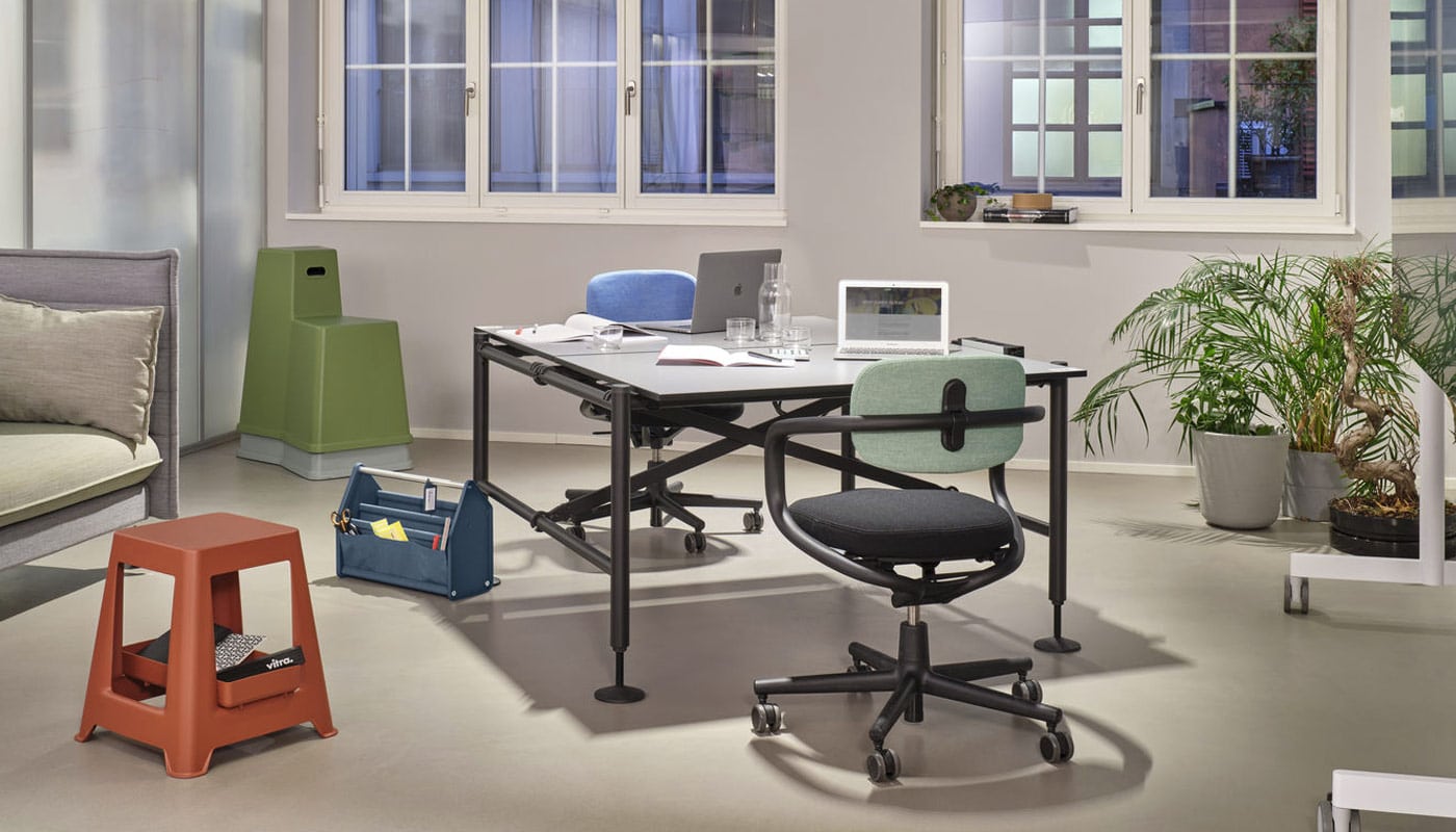 Lo sgabello multifunzione Chap di Vitra fa dell’universalità di utilizzo e dell’aspetto generico i suoi punti di forza.
