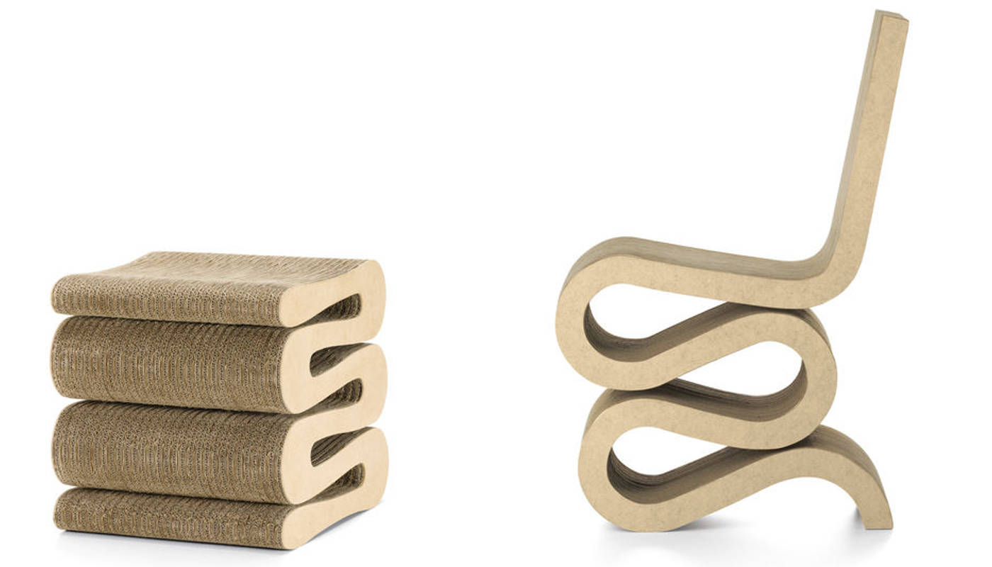 Wiggle Stool sgabello di Vitra, creato nel 1972 da Frank Gehry, fa parte della serie di oggetti denominati “Easy Edges”, esito del suo percorso in cui esplorava le potenzialità estetiche e costruttive di materie d’uso comune e facilmente reperibili, assolutamente inusuali e atipiche nel design.