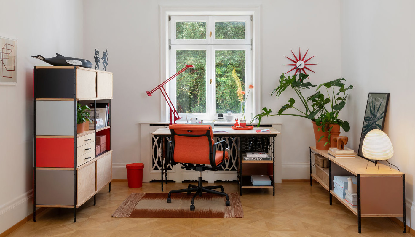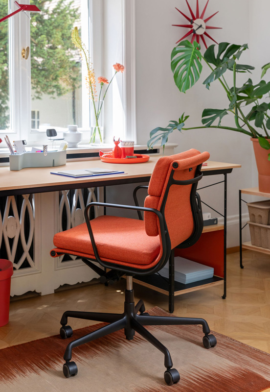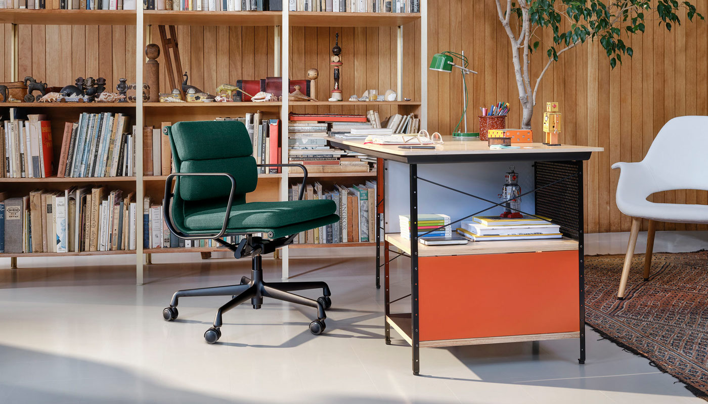 EA 217, poltrona da ufficio disegnata da Charles e Ray Eames nel 1969 per Vitra, ha un grande punto di forza: l’elegante contrasto tra il profilo slanciato dell’alluminio e la morbida rotondità dei cuscini rivestiti in pelle, ulteriore evoluzione della ricerca dei due designer sulle strutture delle sedute da ufficio.