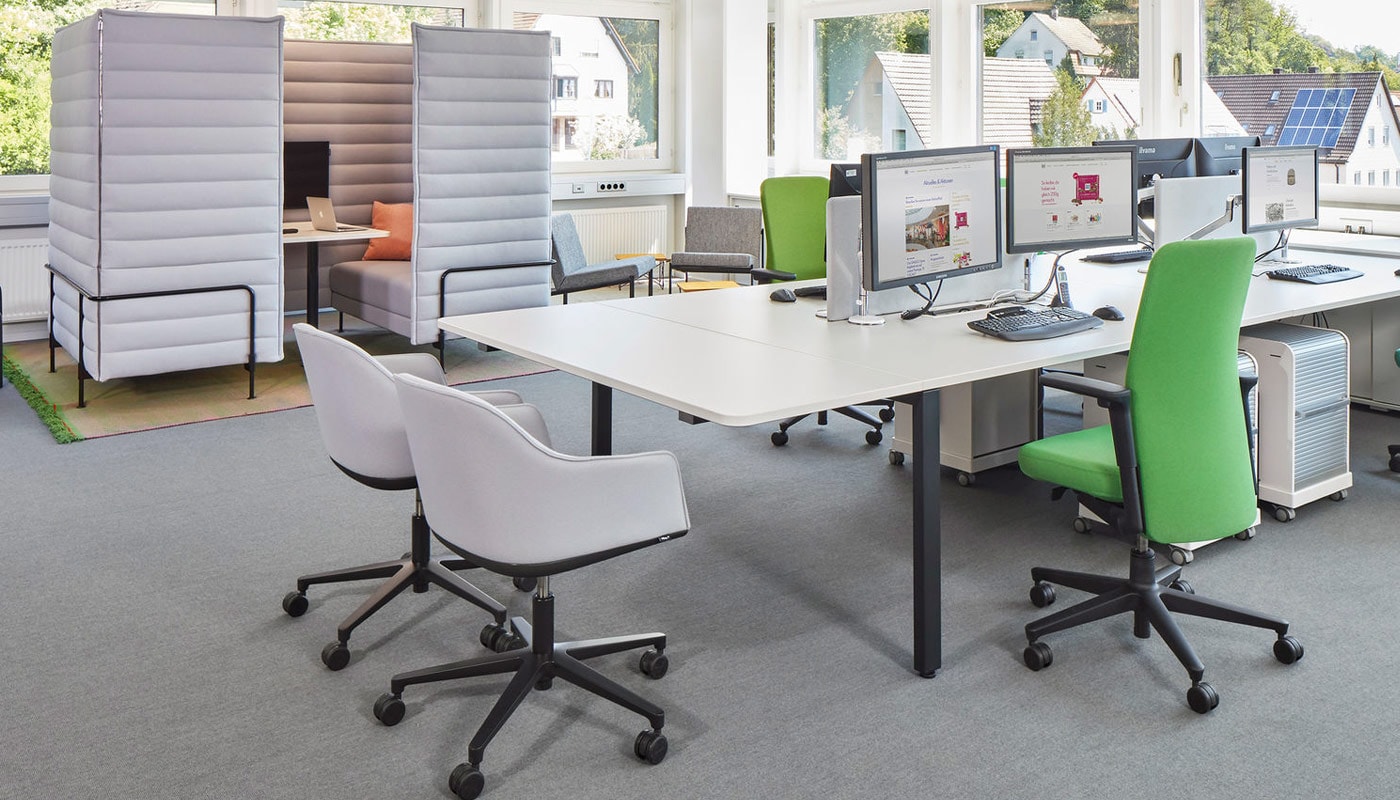 Una seduta girevole su base a quattro razze su pattini, oppure a cinque razze su ruote con regolazione dell’altezza.