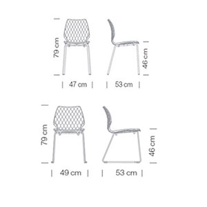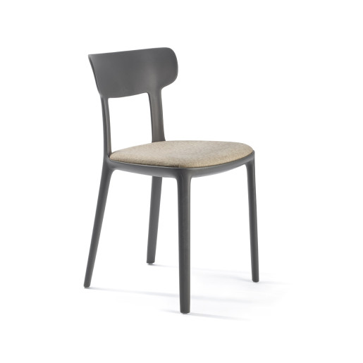 Gambe in tubo d’acciaio, mentre la scocca, come per gli altri modelli della collezione, è in propilene, dotata di un’elegante texture, impilabile e adatta agli ambienti esterni nella versione non imbottita.