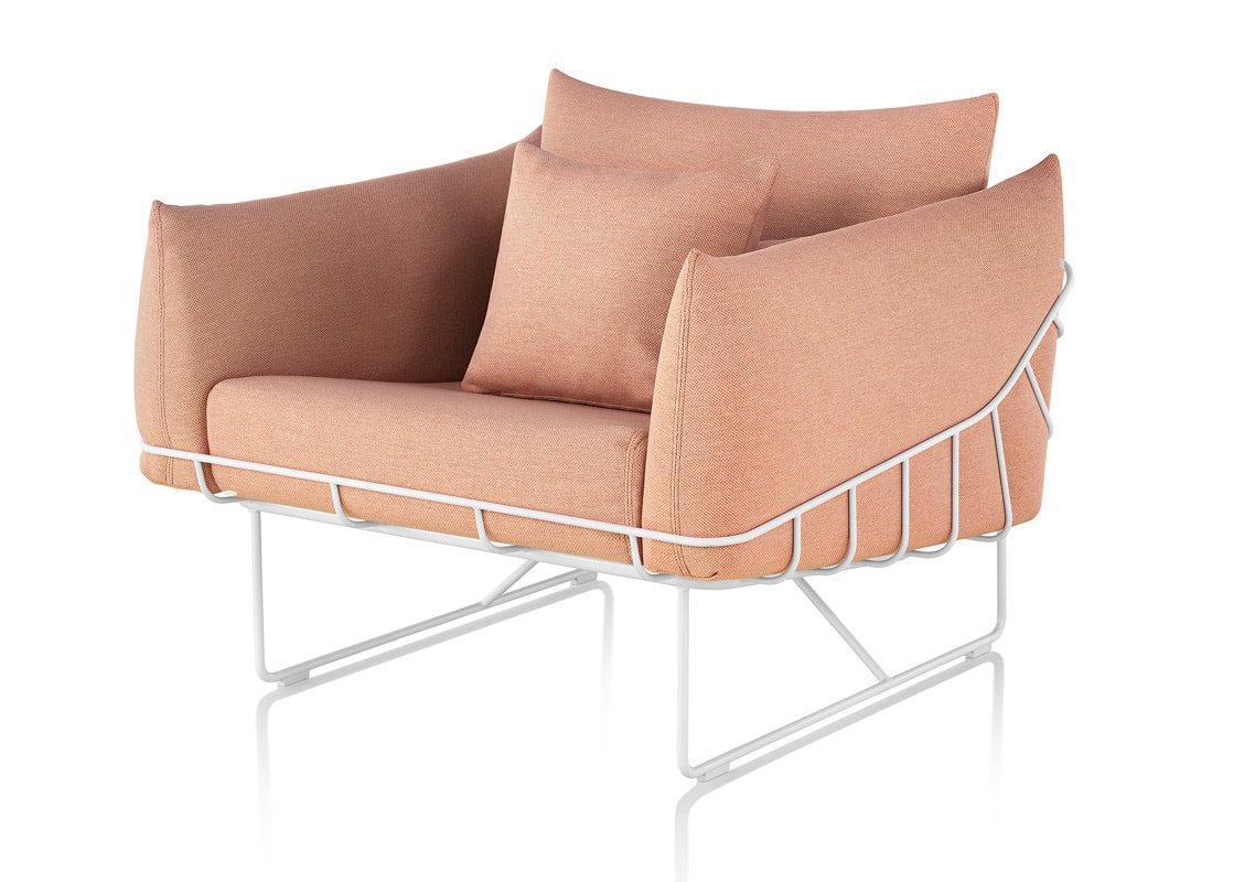 Wireframe Sofa, di Herman Miller, ha un design che esalta il contrasto tra le geometrie del metallo e i volumi morbidi dei cuscini: una raffinata collezione di sofà, che va dalla poltrona al divano a tre posti, firmata da Sam Hecht e Kim Colin.